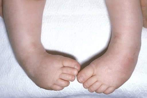 Thông thường, bàn chân khoèo thường được chẩn đoán ngay sau khi đứa trẻ được sinh ra vài ngày. Với biểu hiện: Phần trước bàn chân bị khép, gót và phần sau bàn chân bị vẹo vào. Bàn chân bị đổ kiểu bàn chân ngựa, vòm gan chân bị lõm.