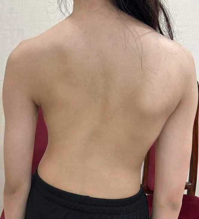 Với biểu hiện: Hai vai bị lệch, bên cao bên thấp. Ụ gồ xuất hiện ở vùng lưng, thường tương ứng với chỗ cột sống bị cong vẹo nhất
